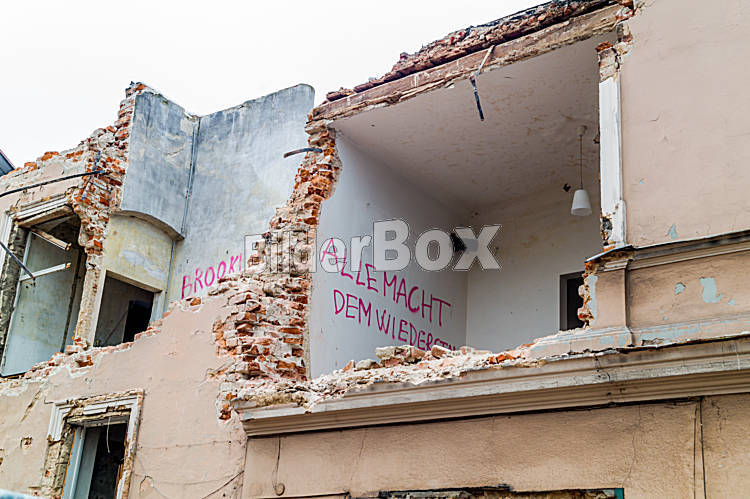 Beschreibung Ein altes Haus wird abgerissen um Platz für den Neubau von Wohnungen zu bekommen. Stadt Erneuerung und Reonovierung