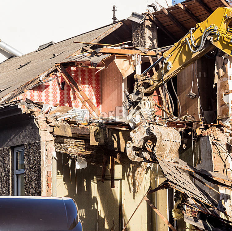 Beschreibung Ein altes Haus wird abgerissen um Platz für den Neubau von Wohnungen zu bekommen. Stadt Erneuerung und Reonovierung