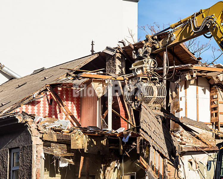 Beschreibung Ein altes Haus wird abgerissen um Platz für den Neubau von Wohnungen zu bekommen. Stadt Erneuerung und Reonovierung