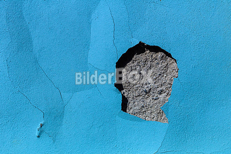 Beschreibung Abgeblätterte blaue Farbe an einem Gebäude, Symbolfoto für Feuchtigkeit und Verfall