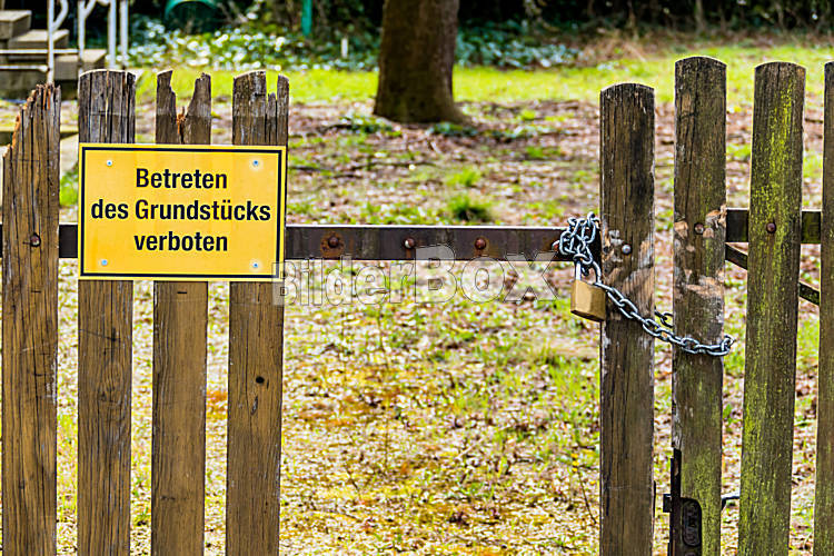 Beschreibung Löchriger Zaun eines Gartens wurde mit einem Schloss verschlossen. Betreten verboten