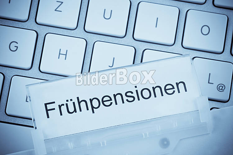 Beschreibung Eine Mappe für Akten im Hängeregister vor einer Computertastatur zum Thema: Frühpensionen