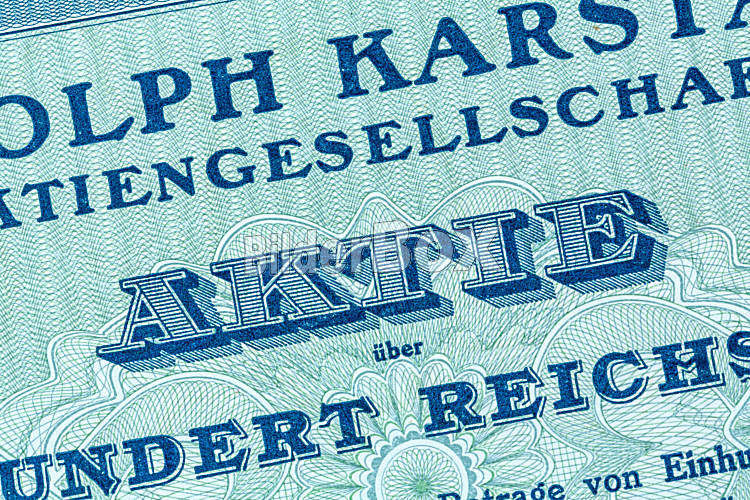 Beschreibung Das Wort Aktie auf einem Wertpapier. Richtige Geldanlage und Investment an der Börse.