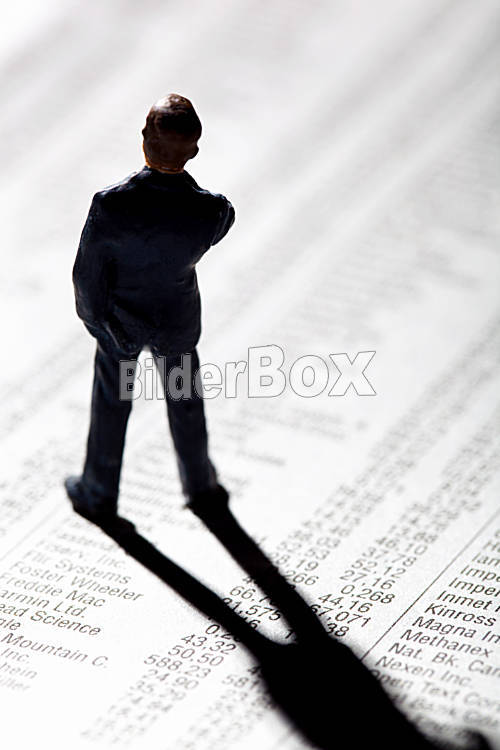 Beschreibung Eine kleine Figur und die Kurse von Aktien in einer Zeitung. Geld verdienen an der Börse. Gewinne und Verluste im Aktienhandel.