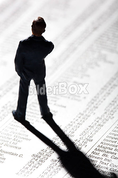 Beschreibung Eine kleine Figur und die Kurse von Aktien in einer Zeitung. Geld verdienen an der Börse. Gewinne und Verluste im Aktienhandel.