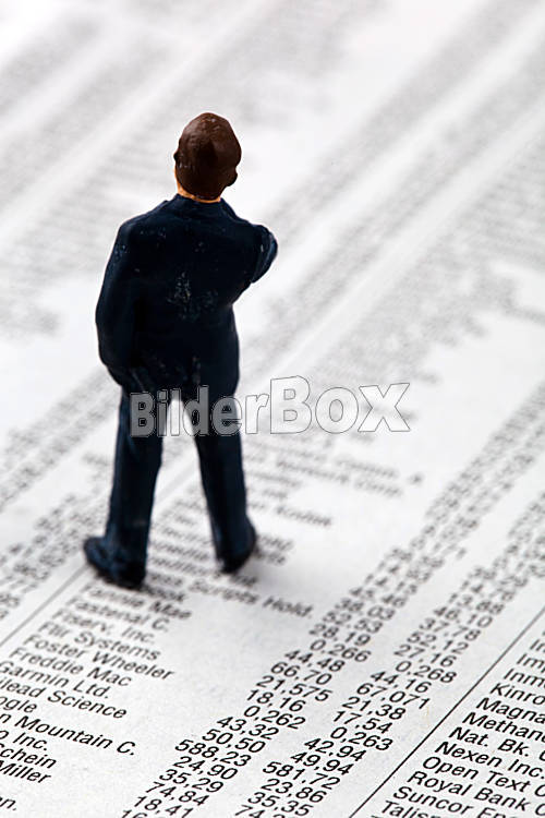 Beschreibung Eine kleine Figur und die Kurse von Aktien in einer Zeitung. Geld verdienen an der Börse. Gewinne und Verluste im Aktienhandel.