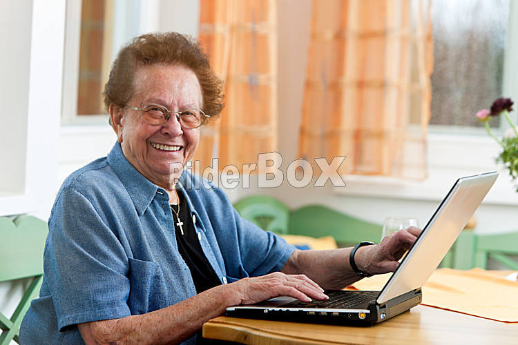 Beschreibung Alte Frau mit Laptop schreibt e-Mail
