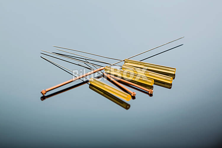 Beschreibung Mehrere Nadel für Akupunktur liegen nebeneinander. Traditionelle chinesische Medizin (Alternative Medizin).