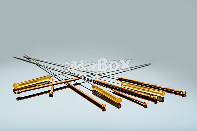 Beschreibung Mehrere Nadel für Akupunktur liegen nebeneinander. Traditionelle chinesische Medizin (Alternative Medizin).