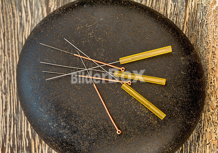 Beschreibung Mehrere Nadel für Akupunktur liegen nebeneinander. Traditionelle chinesische Medizin (Alternative Medizin).