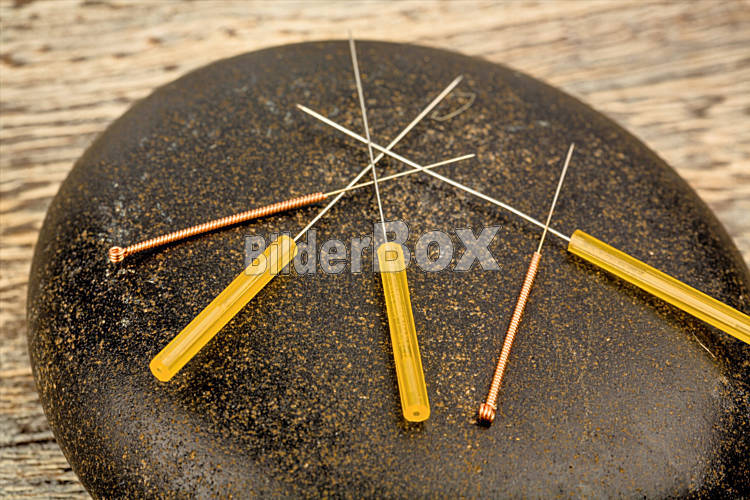 Beschreibung Mehrere Nadel für Akupunktur liegen nebeneinander. Traditionelle chinesische Medizin (Alternative Medizin).