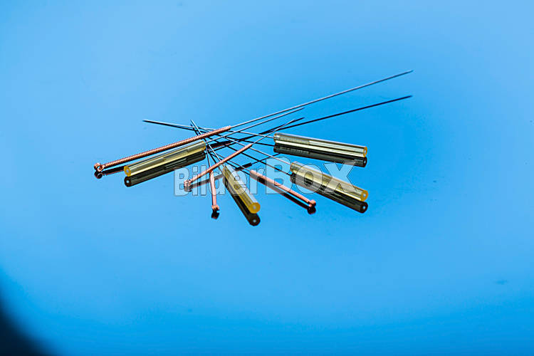 Beschreibung Mehrere Nadel für Akupunktur liegen nebeneinander. Traditionelle chinesische Medizin (Alternative Medizin).