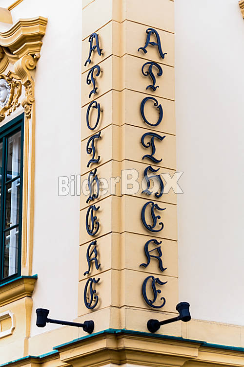 Beschreibung Alte Apotheke, Schild aus Buchstaben an der Fassade