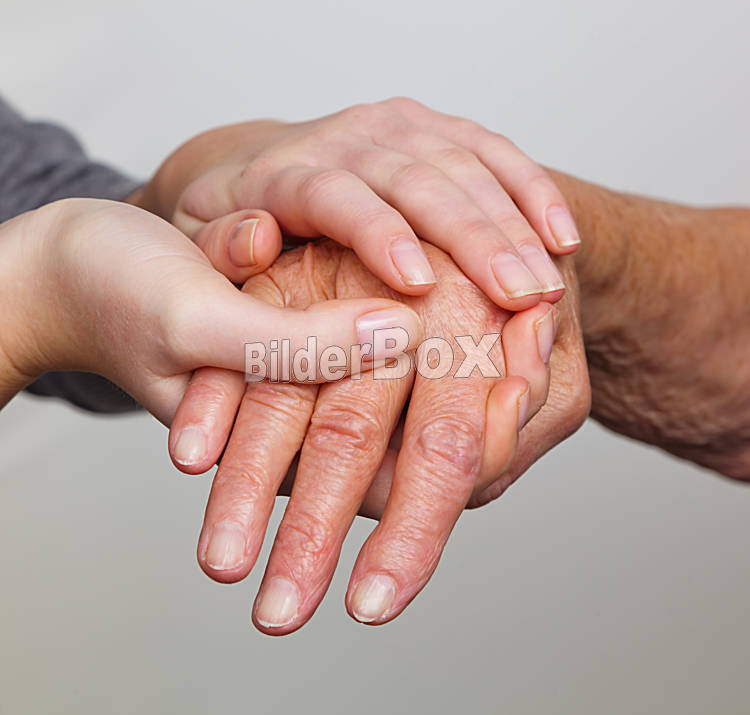 Beschreibung Eine lte und junge Hand mit Gehstock. besuch des Enkel