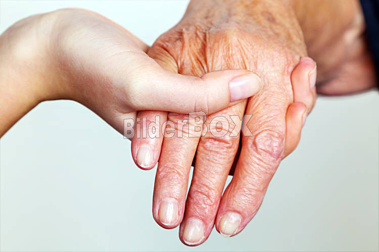 Beschreibung Eine lte und junge Hand mit Gehstock. besuch des Enkel