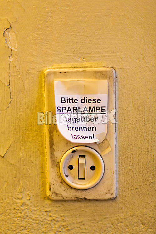 Beschreibung Alter Lichtschalter mit Beschriftung, Sparlampe tagsüber brennen lassen