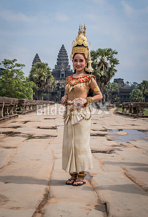 Beschreibung Angkor, Kambodscha - 11/28, 2018: Angkor Wat, dem hinduistischen Gott Vishnu geweiht. Er ist das größte religiöse Bauwerk auf der Welt. Frau in traditioneller Tracht