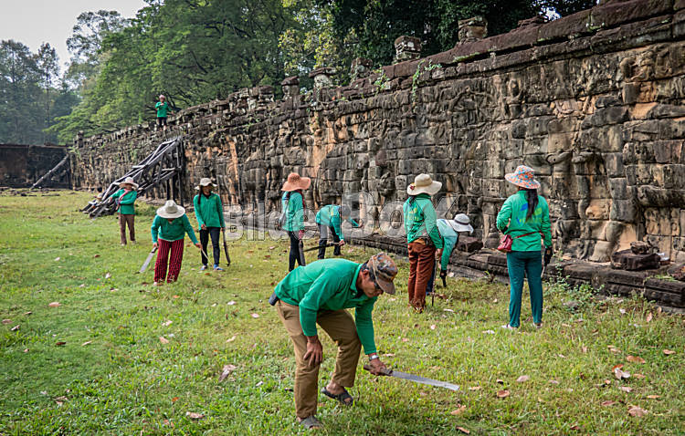 Beschreibung Angkor Thom, Kambodscha - November 28, 2018: Bayon Tempel mit 54 Türmen, die jeweils 4 lächelnde Gesichter des Bodhisattva Avalokiteshvara zeigen. Gärtner mähen den Rasen