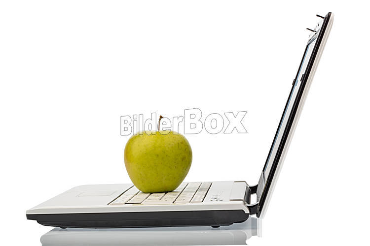 Beschreibung Ein Apfel liegt auf der Tastatur eines Computers. Symbolfoto für gesunden und vitaminreichen Snack.