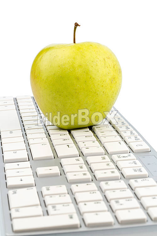 Beschreibung Ein Apfel liegt auf der Tastatur eines Computers. Symbolfoto für gesunden und vitaminreichen Snack.