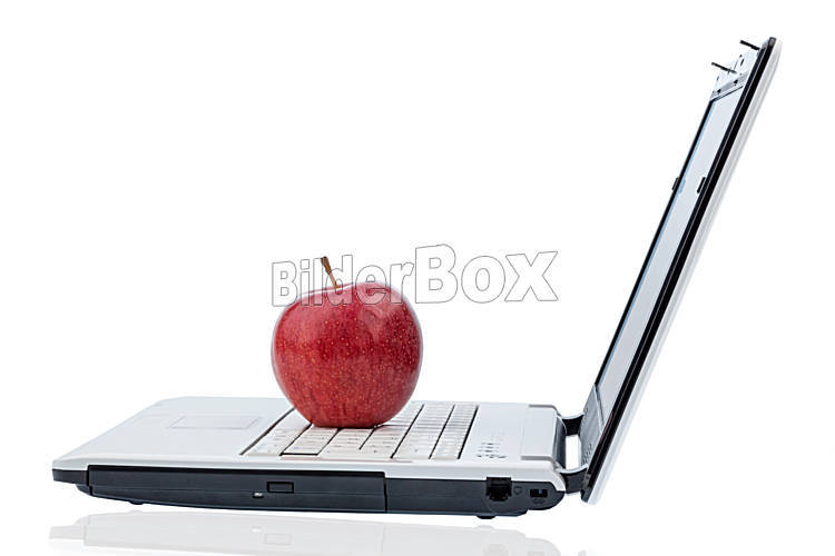Beschreibung Ein Apfel liegt auf der Tastatur eines Computers. Symbolfoto für gesunden und vitaminreichen Snack.