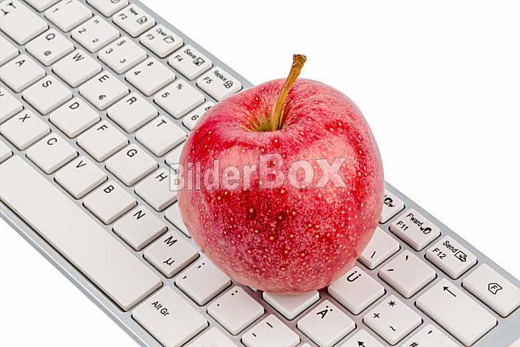 Beschreibung Ein Apfel liegt auf der Tastatur eines Computers. Symbolfoto für gesunden und vitaminreichen Snack.