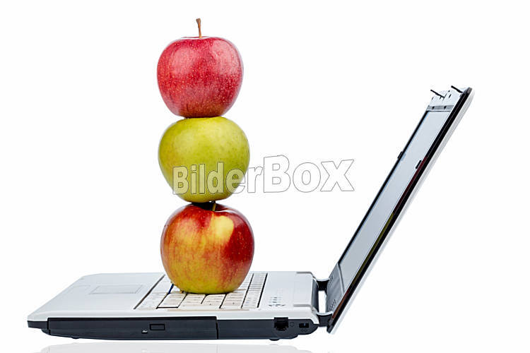 Beschreibung Ein Apfel liegt auf der Tastatur eines Computers. Symbolfoto für gesunden und vitaminreichen Snack.