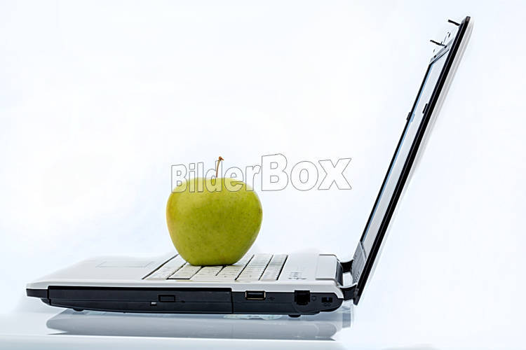 Beschreibung Ein Apfel liegt auf der Tastatur eines Computers. Symbolfoto für gesunden und vitaminreichen Snack.