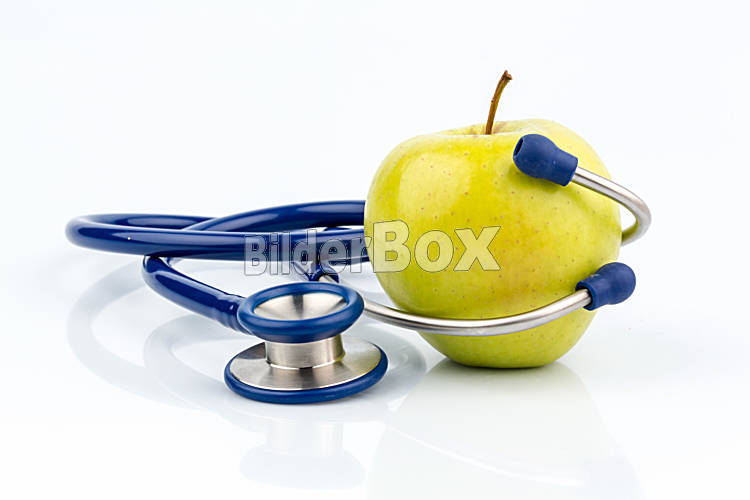 Beschreibung Ein Apfel und ein Stethoskop bei einem Arzt. Symbolfoto für gesunde und vitaminreiche Ernährung.