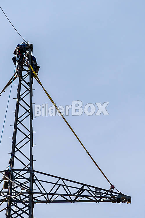 Beschreibung Errichtung einer neuen Hochspannungsleitung. Arbeiter auf Strommasten