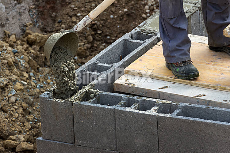Beschreibung Schalsteine werden mit Beton aufgefüllt. Betonarbeiten auf einer Baustelle eines Hauses