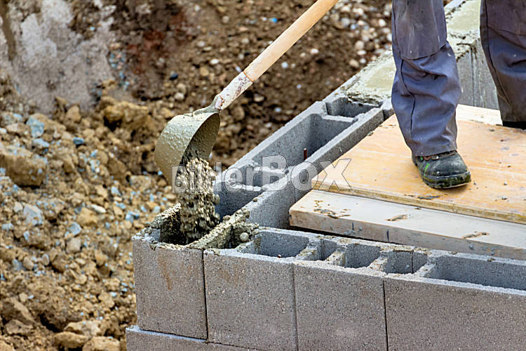 Beschreibung Schalsteine werden mit Beton aufgefüllt. Betonarbeiten auf einer Baustelle eines Hauses