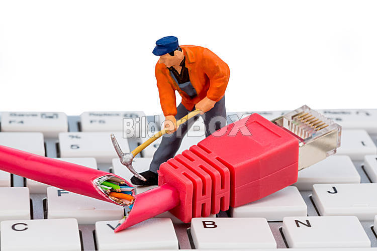 Beschreibung Ein Arbeiter repariert ein Netzwerk Kabel. Symbolfoto für Datensicherheit