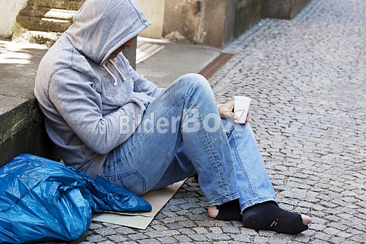Beschreibung Ein arbeitsloser Bettler ist Obdachlos und hat Hunger
