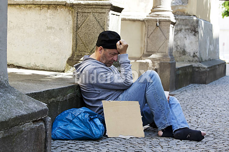 Beschreibung Ein arbeitsloser Bettler ist Obdachlos und hat Hunger