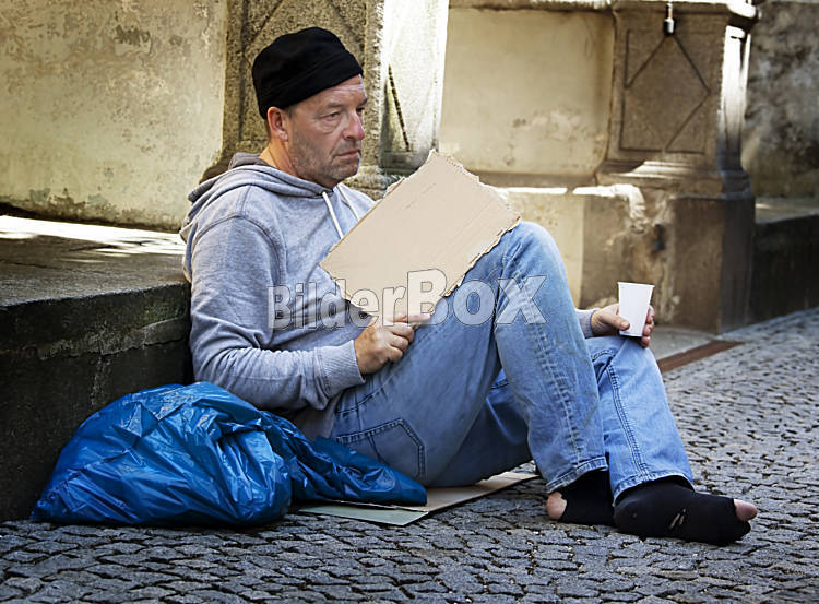 Beschreibung Ein arbeitsloser Bettler ist Obdachlos und hat Hunger