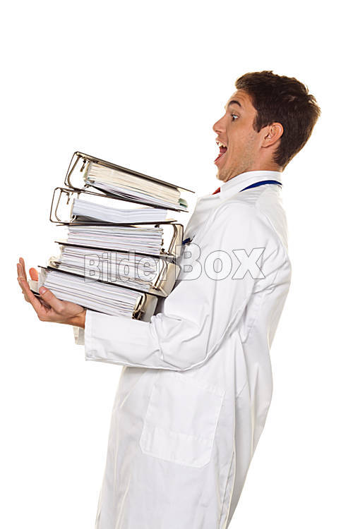 Arzt im Stress mit Akten Stapel. Bürokratie im Krankenhaus.