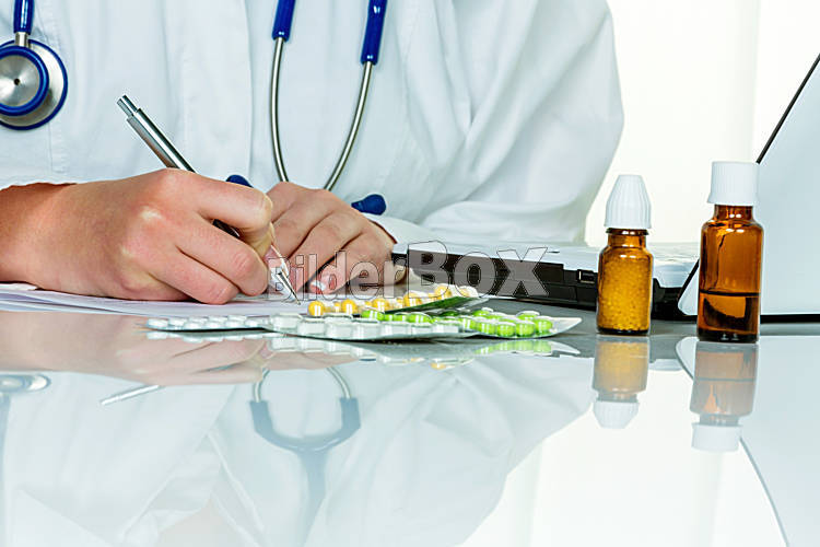 Beschreibung Ein Arzt stellt ein Rezept für Medikamente aus. Rezeptpflichtige Tabletten aus der Apotheke.