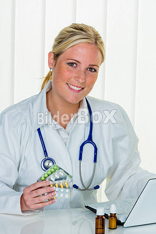 Beschreibung Ein Arzt stellt ein Rezept für Medikamente aus. Rezeptpflichtige Tabletten aus der Apotheke.
