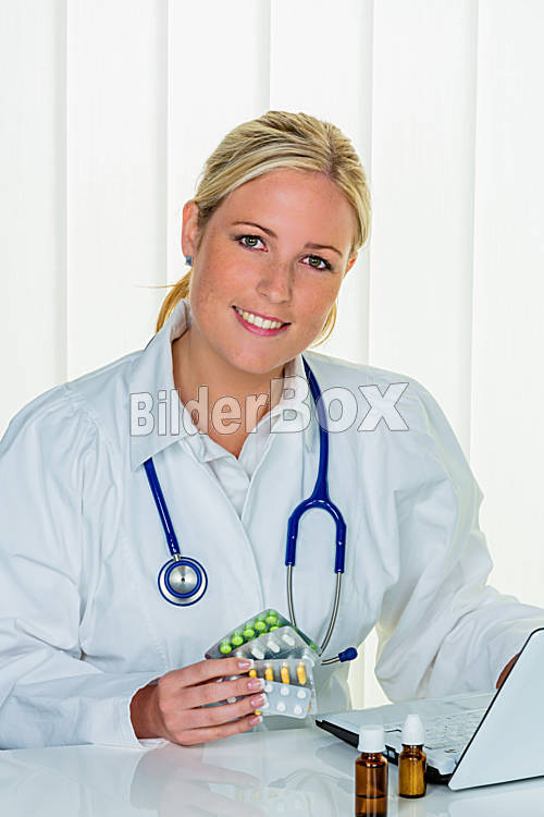 Beschreibung Ein Arzt stellt ein Rezept für Medikamente aus. Rezeptpflichtige Tabletten aus der Apotheke.