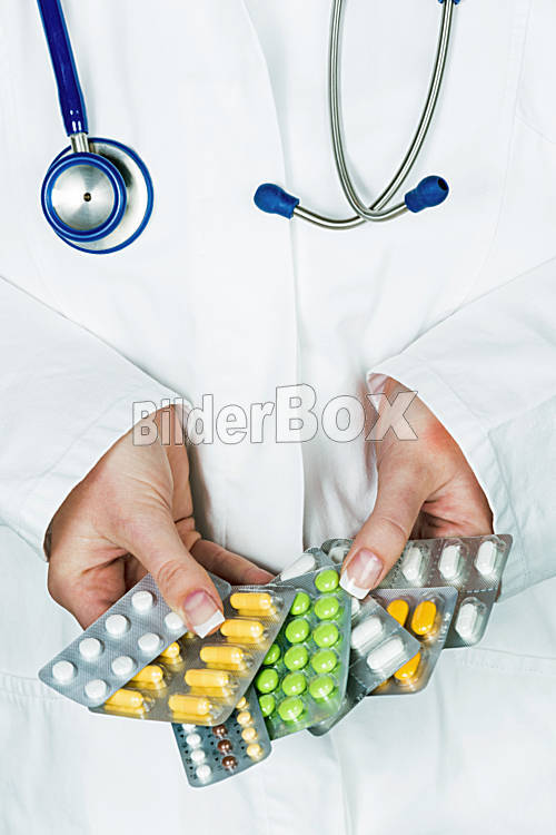 Beschreibung Eine junge Ärztin verschreibt Medikamente. Rezeptpflichtige Tabletten werden vom Arzt verordnet.