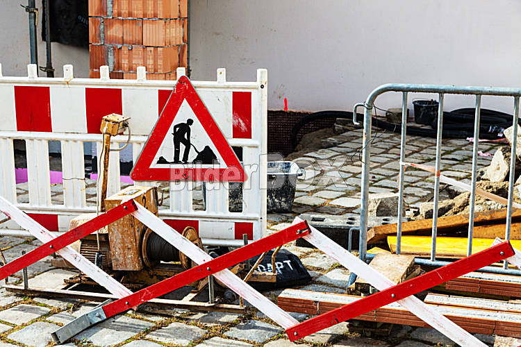 Beschreibung Absicherung der Straße bei einer Baustelle. Schild mit Bauarbeiter