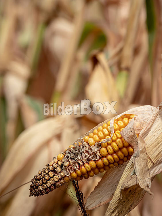 Beschreibung Maisfeld mit Dürreschäden. Durch zu wenig Regen vertrocknen die Felder.