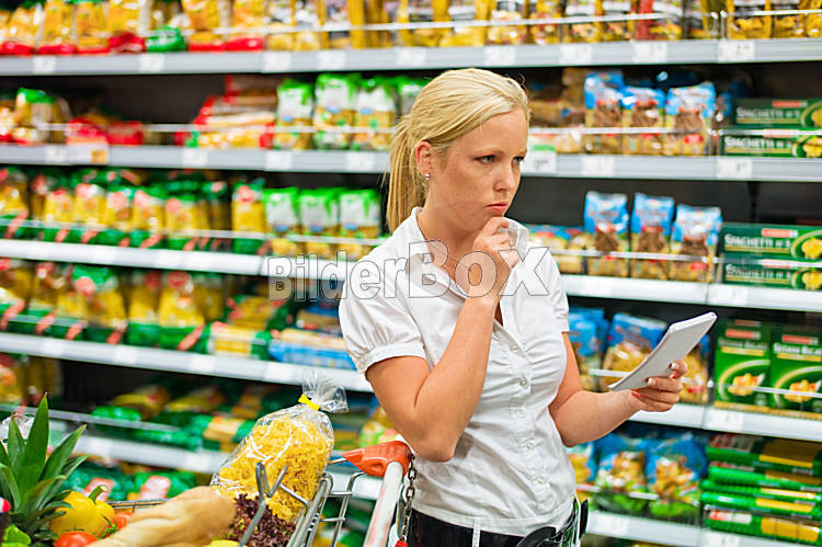Beschreibung Eine Frau ist mit der großen Auswahl in einem Supermarkt beim Einkauf überfordert.