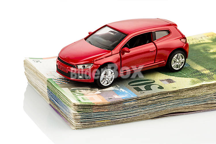 Beschreibung Ein Auto steht auf Schweizer Franken Geldscheinen. Kosten für Autokauf, Benzin, Versicherung und andere Autokosten