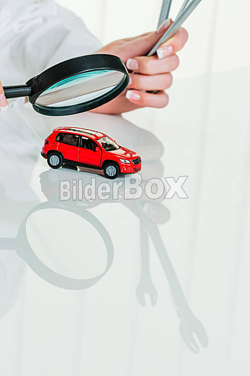 Beschreibung Ein Modell eines Autos wird von einem Arzt untersucht. Symbolfoto für Werkstatt, Service und Autokauf.
