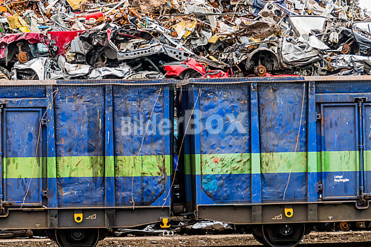 Beschreibung Alte Autos wurden in einer Schrottpresse verschrottet. Verschrottungsprämie für Autowracks. Schrott wird auf die Bahn verladen