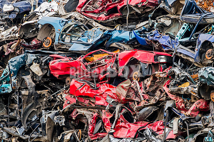 Beschreibung Alte Autos wurden in einer Schrottpresse verschrottet. Alteisen und Verschrottungsprämie für Autowracks