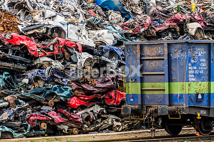 Beschreibung Alte Autos wurden in einer Schrottpresse verschrottet. Verschrottungsprämie für Autowracks. Schrott wird auf die Bahn verladen