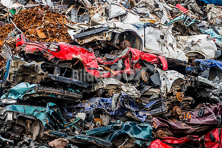Beschreibung Alte Autos wurden in einer Schrottpresse verschrottet. Alteisen und Verschrottungsprämie für Autowracks